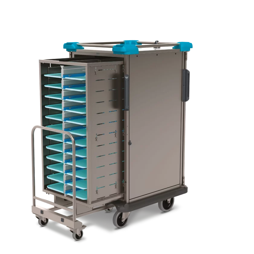 El ERGOSERT es un carro de distribución de alimentos de tecnología neutral que puede acomodar un insert. El carro y su insert proporcionan los enlaces entre la cocina y las distintas unidades del hospital o del catering.
